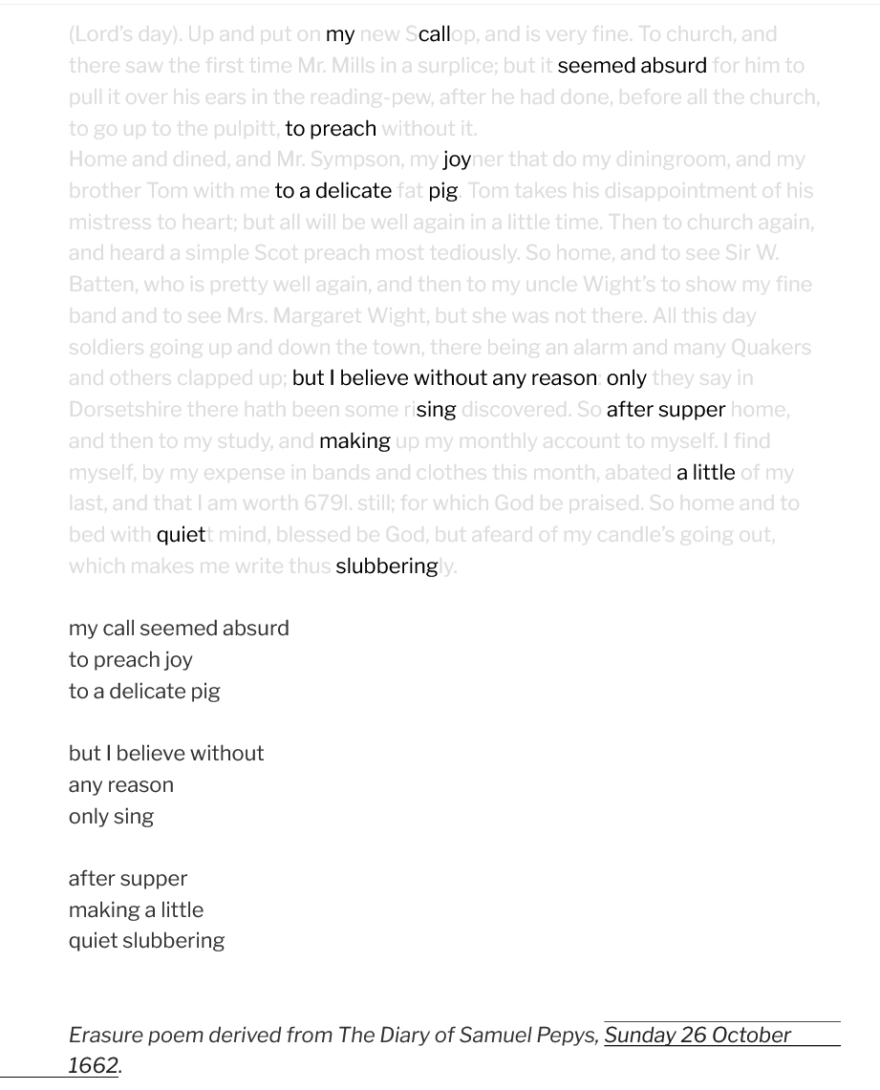 But then I come down to earth and remember that this maybe only works because English grammar is so stripped-down and flexible. It’s worth speculating in how many other languages erasure poetry would even be feasible for more than a few heroic, novelty efforts. I refer to this suitability for erasure poetry as shlang, a word embedded in the phrase English language. A highly inflected language such as Russian could be said to have little shlang, whereas one with no real declensions and verbs that can be left out might have moderate to high levels of shlang, presuming the writing system is (or in the case of Japanese, can be) phonetic rather than symbolic.